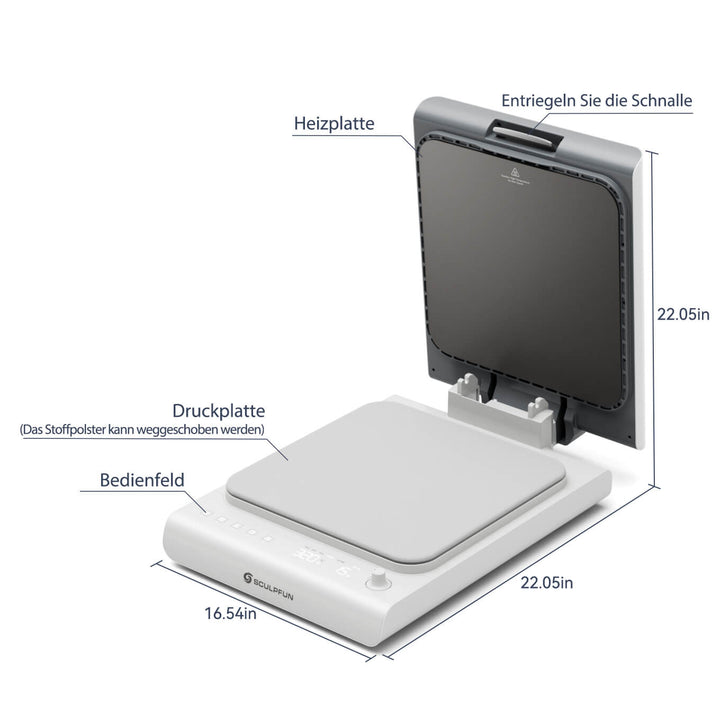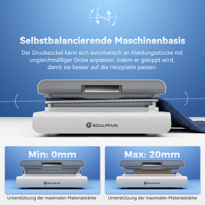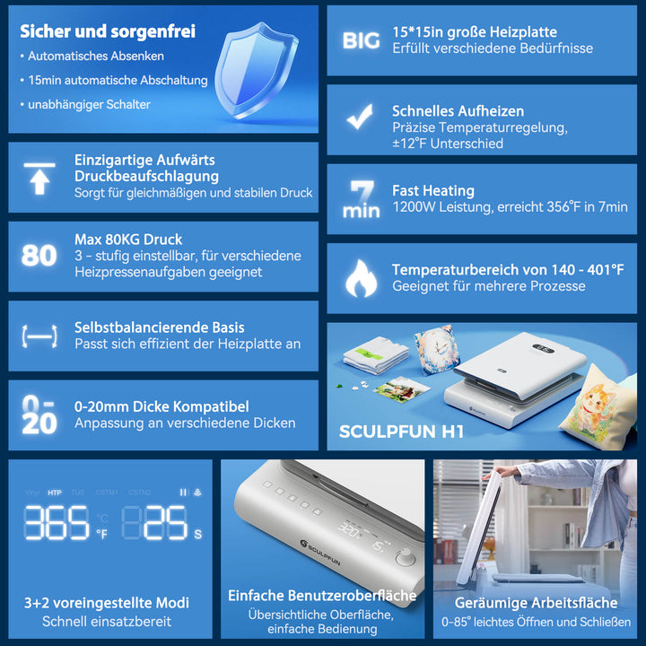 Dank ihres innovativen Aufwärtsdruckdesigns ermöglicht die Sculpfun H1 Transferpresse eine stabile, kontinuierliche und gleichmäßige Druckverteilung. Sie passt sich besser an leichte oder unregelmäßig geformte Materialien an und reduziert Verformungen und Verschiebungen der Werkstücke. Die flexible Bedienung erleichtert die Beobachtung und Einstellung. Die vereinfachte Gerätestruktur erleichtert die Wartung und reduziert das Risiko des Kontakts mit heißen Komponenten, was Sicherheit und Effizienz gewährleistet.