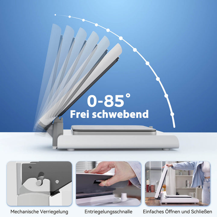 Der maximale Öffnungswinkel beträgt 85°. Das Freie-Schwebe-Design bietet extra großen Arbeitsbereich für flexible Anpassungen und erleichtert das Platzieren von Heißprägematerialien. Egal, ob Sie erfahrener Profi oder Anfänger sind, mit dieser Transferpresse können Sie professionelle Thermotransferprojekte einfach und präzise umsetzen.