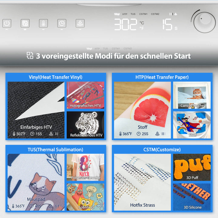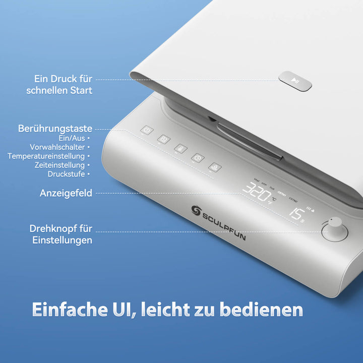Die Sculpfun H1 Transferpresse ist benutzerfreundlich und sofort einsatzbereit. Das Display verfügt über intuitive Bedientasten für einen einfachen und schnellen Zugriff. Die zwei Displays zeigen die Uhrzeit übersichtlich an. Zeit und Temperatur lassen sich über einen Drehknopf einstellen: langsames Drehen für die Feineinstellung, schnelles Drehen für die Schnelleinstellung; langsame Drehung um ±1, schnelle Drehung um ±5. Die H1 Transferpresse bietet außerdem drei voreingestellte Modi, mit denen Sie die idealen Parameter mit nur einem Klick auswählen und gängige Funktionen mit nur einer Taste aktivieren können.