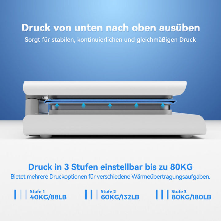 Das einzigartige Bottom-Up-Druckdesign sorgt für gleichmäßigen und konstanten Druck mit einer maximalen Tragkraft von 80 kg. Ideal für DTF-Druck, Thermotransferfolien und verschiedene Materialien und garantiert hochwertige Transferergebnisse.