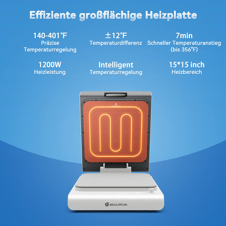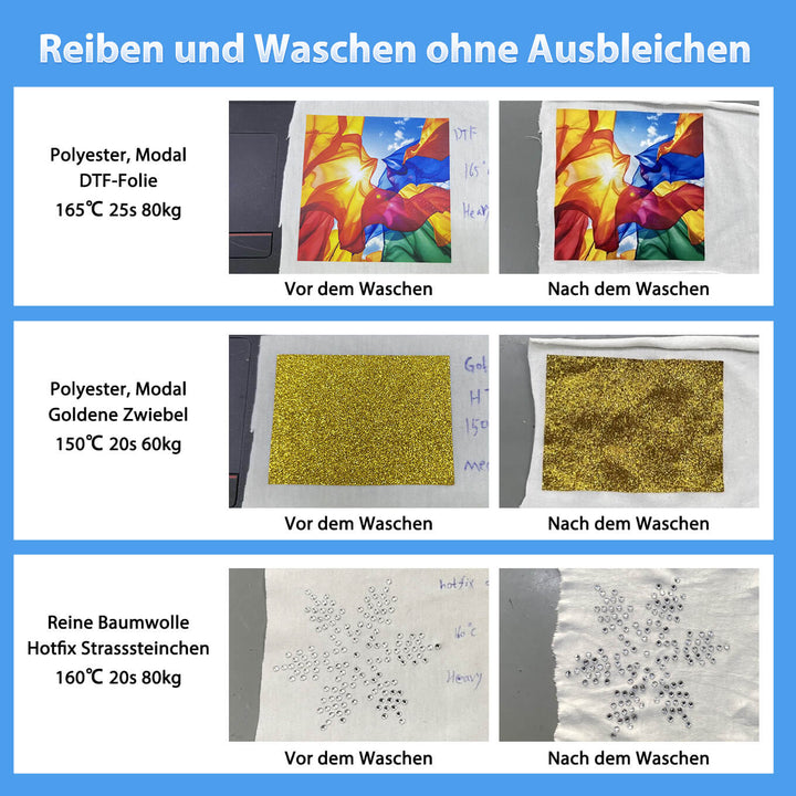 Die 38,1 x 38,1 cm große Heizfläche sorgt für eine gleichmäßige und konstante Wärmeverteilung. Dank präziser Temperaturregelung von 60–200 °C und Doppelrohr-Heiztechnologie liefert er stabile Leistung mit minimalen Schwankungen und hält die Temperaturdifferenz innerhalb von ±7 °C. Die hohe Leistung von 1200 W ermöglicht schnelles Aufheizen. Perfekt für DTF-Druck, Wärmeübertragungsfolien und verschiedene Materialien, garantiert er hochwertige und zuverlässige Transferergebnisse.