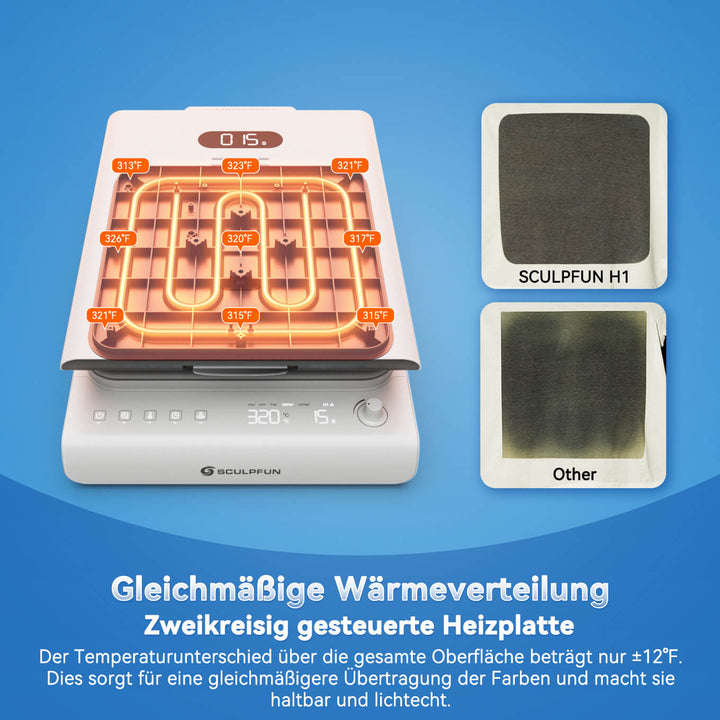 Die SCULPFUN H1 ist eine einsteigerfreundliche Transferpresse, mit der Sie mühelos lebendige, langlebige Designs auf T-Shirts, Hoodies und anderen flachen Textilien erstellen können. Im Vergleich zu UV-Druckern – die oft teuer und kompliziert zu bedienen sind – bietet die H1 eine deutlich einfachere und günstigere Lösung. Dank intuitiver Bedienung und ohne große Lernkurve ist sie die ideale Wahl für Einsteiger und kleine Unternehmen.